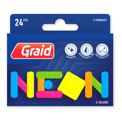 Graid Neon Plasters kombinerer livlige farger med praktisk beskyttelse for mindre skrammer og kutt. Disse vann- og smussavvisende plastrene er perfekte for både barn og voksne som ønsker å tilføre førstehjelpsutstyret et morsomt element. Med perforeringer som fremmer hudens pusteevne og heling, og et sterkt klebemiddel som sørger for at plasteret sitter på plass, er disse plastrene ideelle til hverdagsbruk. Pakken inneholder 24 plaster i flere neonfarger, slik at de er lette å finne når du trenger dem som mest.