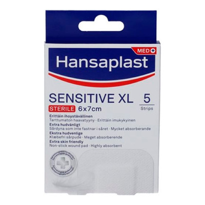Hansaplast Sensitive XL er hudvennlige og sterile plaster for mellomstore sår som ikke trekker i hud eller hår