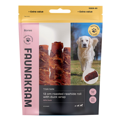 Faunakram 13 cm Roasted Rawhide Roll med andefyll er tilgjengelig her i en verdipakke på 300 gram. Produktet kommer i en praktisk, gjenlukkbar pose som holder godbitene friske. Det produseres i Kina i en IFS-sertifisert fabrikk som oppfyller Faunakrams krav til kvalitet, hygiene og sporbarhet.