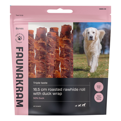Faunakram 16,5 cm Roasted Rawhide Roll med andefars er en stor tyggerull for hunder i alle størrelser