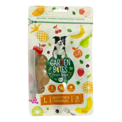Garden Bites Fruity Toothpaste fra DuvoPlus gir en ny dimensjon av helse og nytelse til hundens mellommåltid. Disse vegetariske tyggetabbene, med hele 55 % søtpotet, er ikke bare deilige, men også næringsrike og beriket med viktige vitaminer, kalsium og jern. Varianten "Fruit Blast" kombinerer smakene av banan, fersken og pære for en fruktig smak.