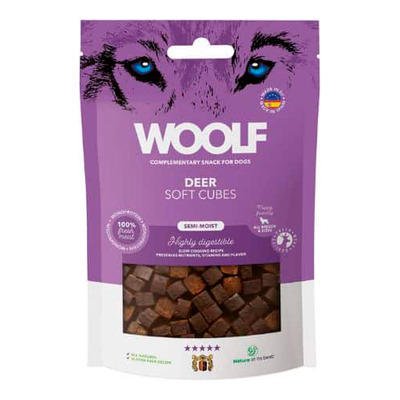 Woolf Soft Cubes Deer produseres i Spania og leveres i en praktisk, gjenlukkbar pose. Den lille størrelsen gjør dem ideelle til trening og daglige belønninger, uavhengig av hundens alder eller størrelse.