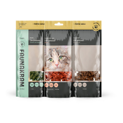 Faunakram Cat Pillows Valuepack inneholder tre populære snacks i én praktisk pakke. Du får laks og tranebær, kylling og tang samt biff og torsk. Disse snacksene har en sprø overflate og en myk kjerne som kattene elsker. De ulike smakene støtter alt fra munnhygiene til fordøyelse og vektkontroll. Les mer på emballasjen.