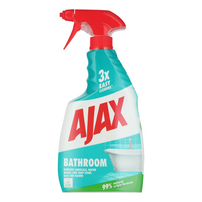 Ajax Baderomsspray rengjør i dybden og fjerner kalk, vannflekker og såperester umiddelbart. Den etterlater overflatene glitrende rene og med en frisk duft. Sprayen er vegansk, har en 99 % biologisk nedbrytbar formel og leveres i en 100 % resirkulerbar plastflaske.