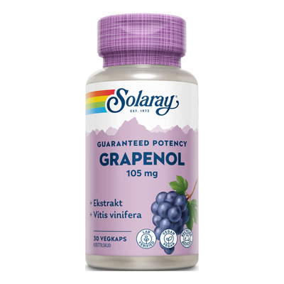 Solaray Grapenol er et kosttilskudd som inneholder en kombinasjon av druekjerneekstrakt og sitronfruktekstrakt innkapslet i en vegetabilsk kapsel, noe som også gjør det egnet for veganere. Druekjerneekstrakt bidrar til å støtte de fine blodårene/kapillærene. Kapillærene er de minste blodårene i blodtransportsystemet. Oksygen og næringsstoffer tas opp gjennom kapillærveggen, og avfallsprodukter skilles ut når blodet passerer gjennom.
