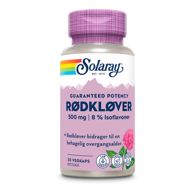 Solaray Rødkløver inneholder 500 mg rødkløverekstrakt per kapsel fra blomsten og de overjordiske delene. Ekstraktet er standardisert til et innhold på 8 % isoflavoner, noe som tilsvarer 40 mg per kapsel. Rødkløver er en naturlig kilde til fytoøstrogener og brukes ofte i overgangsalderen. Tilskuddet er vegansk og laboratorietestet, og kapslene er laget i en vegetabilsk kapsel.