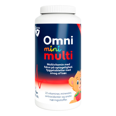 OmniMini Multi er et barnevennlig, velsmakende og komplett multivitamintilskudd for barn i alderen 3-10 år. Tyggetablettene med naturlig bærsmak inneholder alle nødvendige og viktige vitaminer og mineraler for en kropp i vekst - faktisk inneholder kosttilskuddet 22 ulike vitaminer, mineraler og andre næringsstoffer.