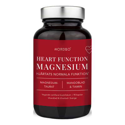 NORDBO Hjertefunksjonsmagnesium inneholder en kombinasjon av tiamin, magnesiumtaurat og CareFlow®. Tiamin er et vannløselig koenzym som ikke kan produseres av kroppen selv, men må tilføres gjennom kosten. Tiamin finnes blant annet i hjertet og hjernen og bidrar til hjertets normale funksjon. Magnesiumtaurat består av magnesium bundet til aminosyren taurin. Taurin er den aminosyren som oftest finnes i hjertet. Magnesium bidrar til normal muskelfunksjon (hjertet er en muskel). CareFlow® er et mangoekstrakt som er testet i en klinisk studie på mikrosirkulasjon.