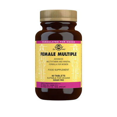 Solgar Female Multiple er et kosttilskudd i tablettform sammensatt spesielt til kvinner. Det inneholder en rekke utvalgte næringsstoffer - herunder vitamin C og E, som begge er kraftige antioksidanter og beskytter kroppens celler mot oksidativt stress, vitamin B1, B2, B3, B12 samt mineralene kalsium, jod, sink og magnesium.