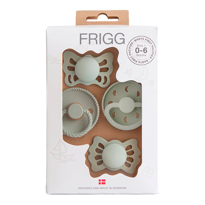 FRIGG Baby's First Starter Pacifier Pack - Moonlight Sailing Sage er en 4-pakning med smokker som gjør det enklere for foreldre å finne den riktige smokken til barnet. Pakken inneholder fire ulike FRIGG-modeller med varierende smokketyper og materialer, slik at barnet kan prøve ut hva som passer best. Alle smokkene er i størrelse 1 og er designet og produsert i Danmark.