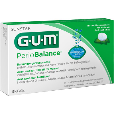 GUM Perio Balance er en daglig dental probiotisk sugetablett med mintsmak som er klinisk bevist å redusere plakk og fremmer sunne tenner og tannkjøtt.