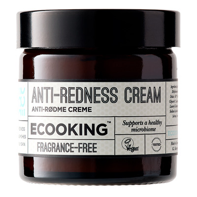 Ecooking Anti Redness Cream er en beroligende krem som effektivt reduserer irritasjon og forebygger rødhet. Med et prebiotisk virkestoff fremmer kremen hudens gunstige bakterier og bekjemper skadelige bakterier. Dette fremmer et sunt mikrobiom, minimerer urenheter og reduserer rødhet. Havrekjerneekstrakt beroliger huden og beskytter mot frie radikaler, mens hyaluronsyre, vitamin E, aprikoskjerneolje og sheasmør gir rikelig med fuktighet og pleie.