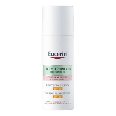 Eucerin DermoPurifyer Protective Fluid SPF30 er en ultralett dagkrem med 3 nøkkeleffekter til daglig pleie av fet hud med merker fra urenheter. Den er beriket med blant annet decanediol, som hjelper med å redusere arr og mørke flekker fra urenheter, for å gi en jevnere hudtone. Licochalcone A beroliger rød og irritert hud, mens en innovativ teknologi holder huden langvarig matt. Eucerin DermoPurifyer Protective Fluid SPF30 har UVA- og UVB-filtre for å beskytte mot solskader og forverring av synlige merker fra uren hud.