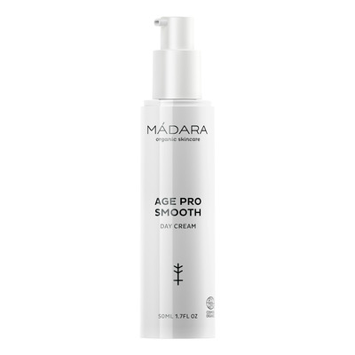 Mádara AGE PRO Smooth Day Cream er en fuktighetsgivende ansiktskrem utviklet for moden hud. Dagkremen er beriket med nordisk bjørkevann, som støtter hudens naturlige fornyelse. Den inneholder også røde makroalger og marine mikroalger som bidrar til å styrke hudens fasthet og elastisitet. Den lette konsistensen absorberes raskt og etterlater huden myk, beroliget og oppfrisket.
