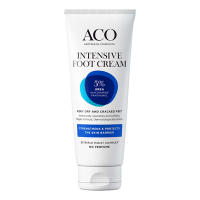 ACO Intensive Foot Cream er en ekstra rik fotkrem utviklet for svært tørr og hard hud. Med 5 % urea, 2 % niacinamid og 4 % panthenol gir kremen dyp fuktighet og styrker hudbarrieren. Den absorberes raskt og etterlater huden myk og smidig uten å føles fet. Parfymefri og dermatologisk testet, ideell for sensitiv hud.