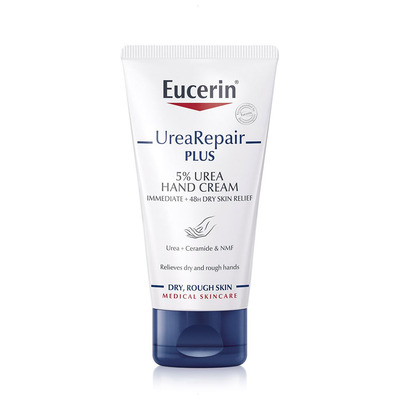Eucerin UreaRepair Hand Creme inneholder 5% Karbamid og melkesyre, som hurtig lindrer tørr og irritert hud. Håndkremen har også en lindrende virkning på håndeksem, ved å tilføre hendene intensiv fukt som holder i lang tid. Hendene våre er et av kroppens mest utsatte steder, da de både utsettes for kaldt vær, vann, såpe og andre kjemikalier, noe som lettere kan medføre en svekket hudbarrierefunksjon, som fører til at hendene lettere blir tørre. Derfor er det viktig å pleie dem, noe du effektivt kan gjøre med ved å bruke Eucerin Repair Hand Cream.