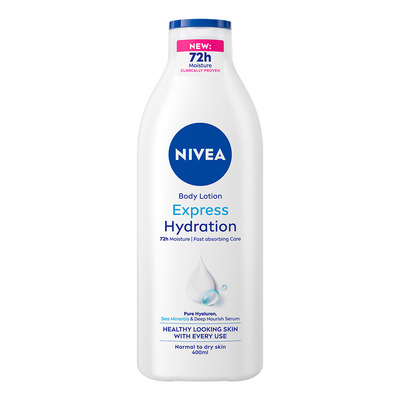 Nivea Express Hydration Body Lotion er en dypt fuktighetsgivende bodylotion som gir huden fuktighet i opptil 48 timer. Den er beriket med Niveas Deep Moisture Serum og klistrer ikke på huden. Bodylotionen trekker raskt inn i huden og etterlater huden fuktet og næret. Den passer for alle hudtyper, også tørr hud. Bodylotionen er også dermatologisk testet.