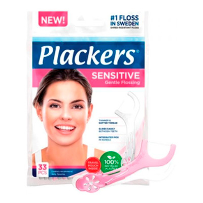 Plackers Sensitive Gentle Flossing-tanntråd er utformet for å være myk og tynn, noe som gjør det mulig å bruke tanntråd skånsomt mellom tennene uten å skade tannkjøttet. Håndtaket har en innebygd tannpirker som enkelt kan bøyes forover, noe som gir rengjøringen en ekstra dimensjon. Denne funksjonen gjør det også mulig å rengjøre tyggeflatene på tennene. Tannreguleringen er laget av 100 % resirkulert plast, og pakken inneholder både hvite og rosa tannreguleringsbøyler samt en praktisk reiseveske.