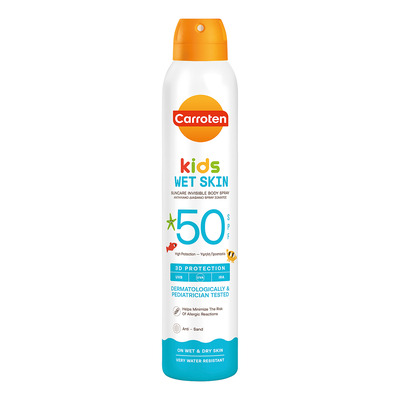 Carroten Dry Mist SPF 50 Kids Wet/Dry er en innovativ solbeskyttelse for barn som kan brukes på både våt og tørr hud