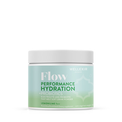 Wellexir Flow Hydration Lemon/Lime er en forfriskende brusblanding med elektrolytter, probiotika og vitaminer